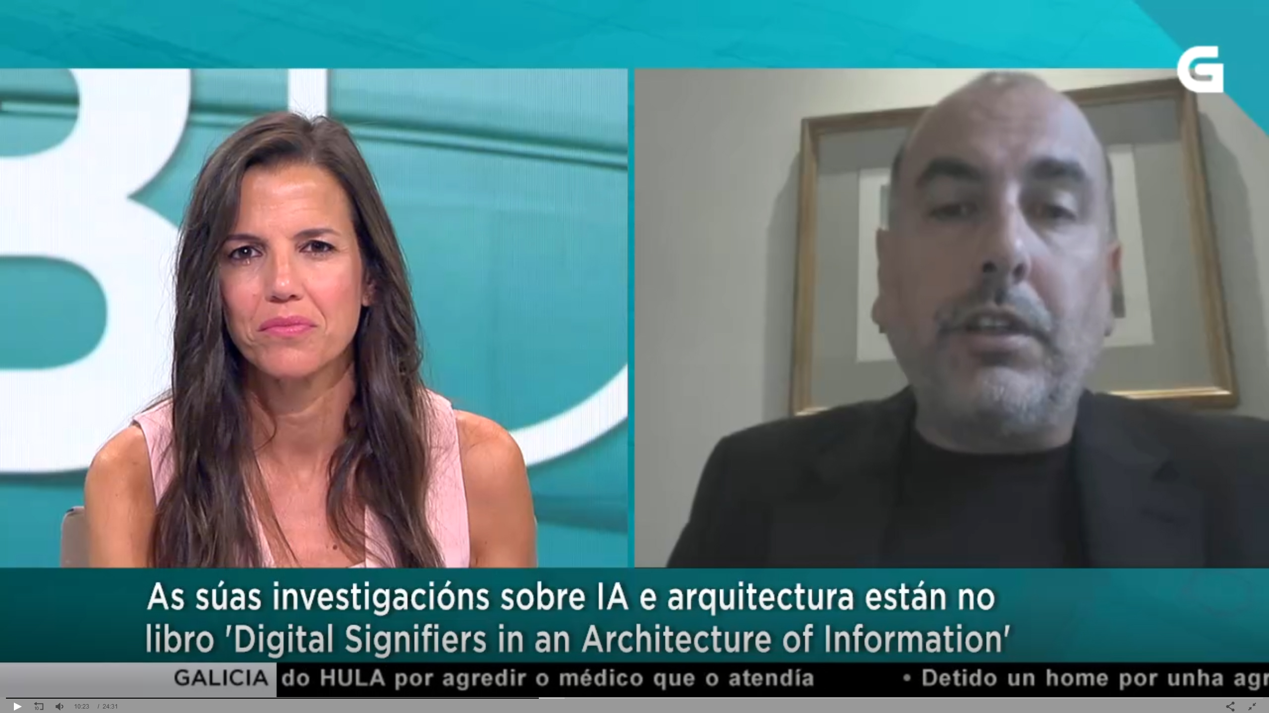 2023-06 Pablo Lorenzo-Eiroa's discusses with Almudena de Urzaiz in Bos Dias main TV news Television de Galicia RTVG his research and book on AI Digital Signifiers in an Architecture of Information: From Big Data and Simulation to Artificial Intelligence" Pablo Lorenzo-Eiroa, Routledge, London, 2023