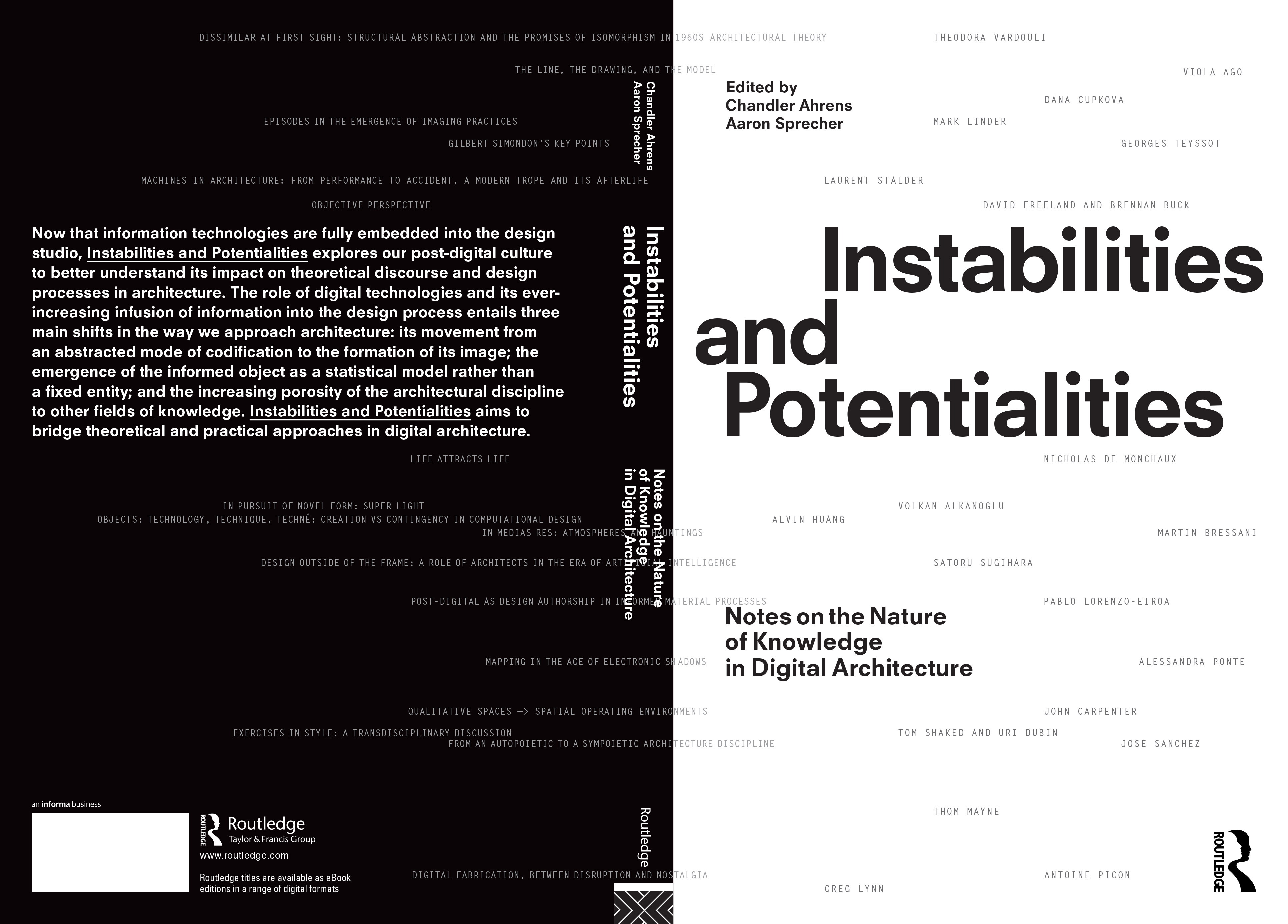Now that information technologies are fully embedded into the design studio, Instabilities and Potentialities explores our post-digital culture to better understand its impact on theoretical discourse and design processes in architecture. The role of digital technologies and its ever-increasing infusion of information into the design process entails three main shifts in the way we approach architecture: its movement from an abstracted mode of codification to the formation of its image, the emergence of the informed object as a statistical model rather than a fixed entity and the increasing porosity of the architectural discipline to other fields of knowledge. Instabilities and Potentialities aims to bridge theoretical and practical approaches in digital architecture. From the editors